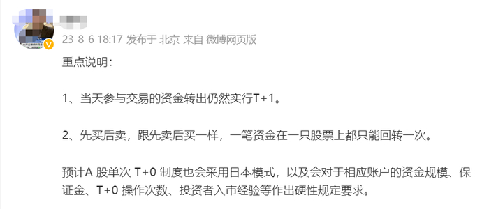 该传闻特别重点说明,首先是当天参与交易的资金转出仍然实行T+1;其次是先买后卖,跟先卖后买一样,一笔资金在一只股票上都只能回转一次。