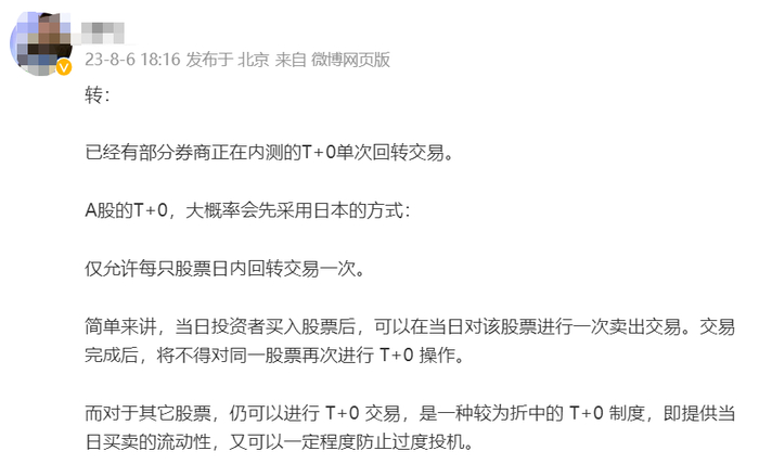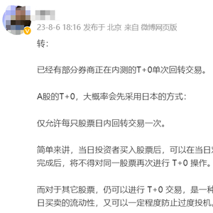 财联社8月6日讯(记者高艳云) “T+0交易内测”的传闻成为这个周末讨论最多的消息之一。