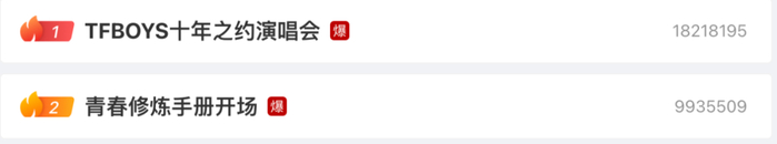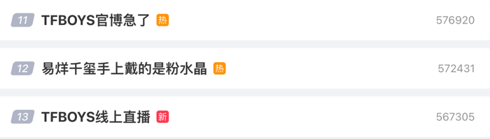 当日晚间,与TFBOYS相关的多个词条也冲上了微博、百度等平台热搜。