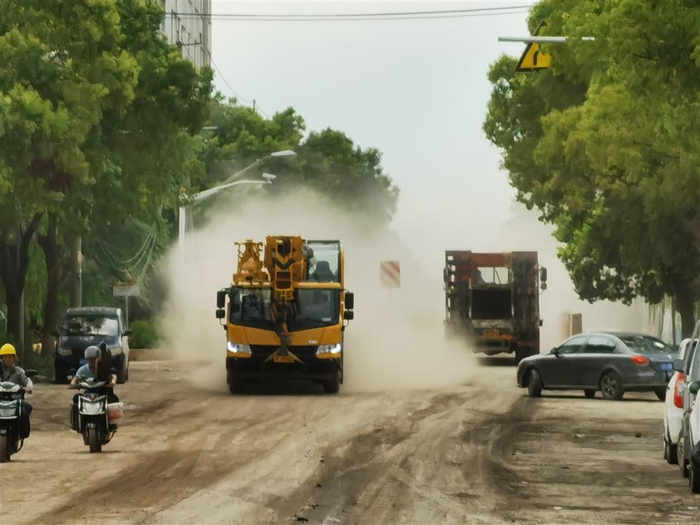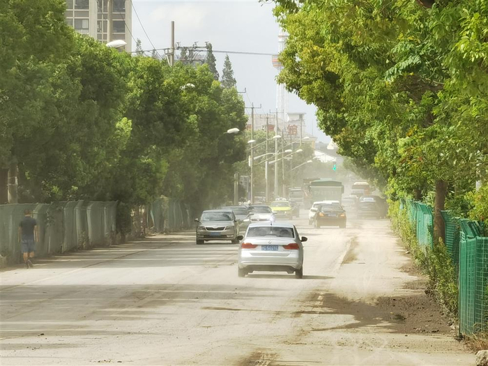 此外,记者在该区域采访时,也留意到施工方组织了洒水车每天上下午分别对上述道路洒水降尘。但由于太阳暴晒,降尘效果极其有限。洒水车驶过时还会将路面的尘土砂砾喷到路人身上,惹来众怒。