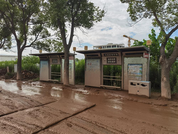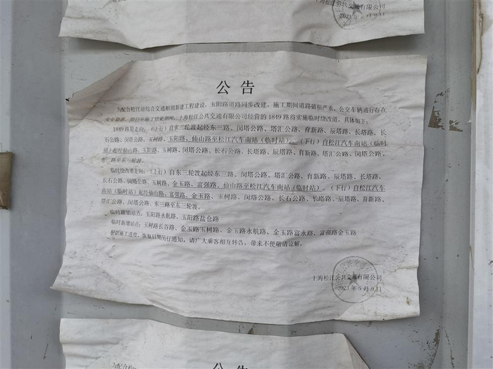 步行至玉阳路中段时,记者留意到,路北侧还有一个公交站,站亭顶部写着“仓城影视园”,但目前整个站都陷在淤泥里。附近一家企业的员工贺女士告诉记者,玉阳路变成目前这样已有段时间,而早在今年5月,多条公交线路就因为玉阳路路况实在太差,而改道从东侧的富强路绕行前往地铁松江南站站。在地铁松江南站站1号口外,记者找到了几份公交线路改道的公告,上面称改道原因是公交车在玉阳路上通行已“存在安全隐患”。