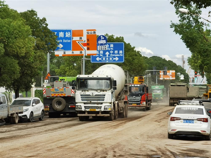 7月30日,记者前往9号线松江南站周边调查了解。在地铁松江南站西南侧不远处,是铁路松江南站。而在建中的“松江枢纽”位于地铁站松江南站站前广场,因此,地铁松江南站站和铁路松江南站周围一圈都成了工地,原有的多条进站道路都消失了。取而代之的是,一条新建的临时水泥便道从地铁松江南站站的1号口外,穿过大大小小的工地,先向北延伸与南北向的富强路联通,再一路斜穿工地向西,与东西向的玉阳路联通,途中还与南北向的盐平路、富永路垂直交叉。水泥便道与原有道路结合,构成了松江南站目前的交通体系。