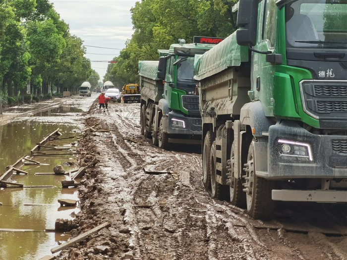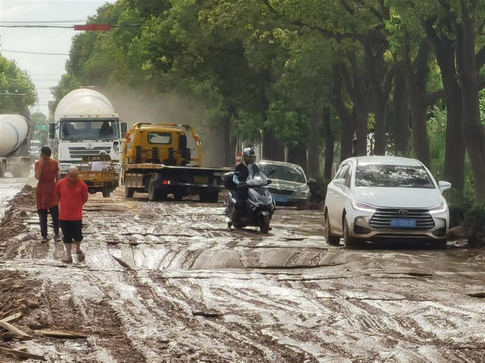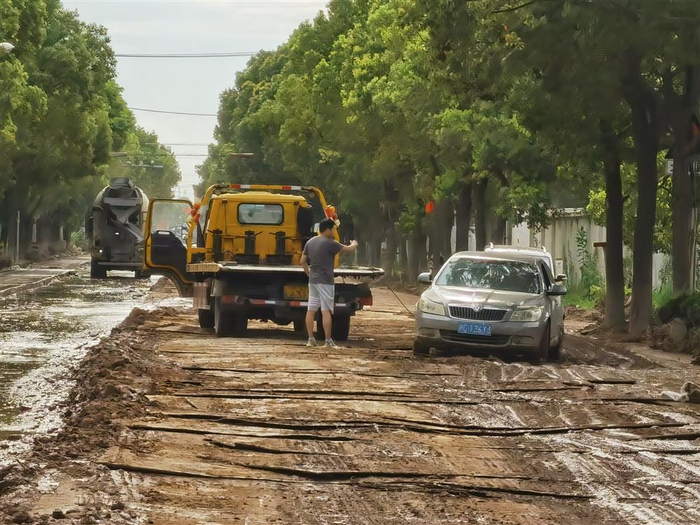 △玉阳路上,一辆车因深陷淤泥而抛锚,救援车正在想办法将其拉出来。
