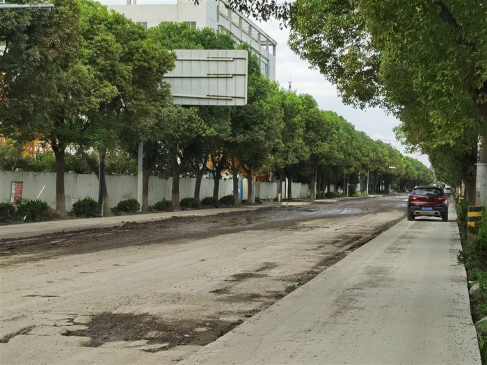 玉阳路是地铁松江南站站周边道路的一个缩影。由于工地面积大,土方车数量多,多条道路均不堪土方车重压。南北向的富永路、盐平路、永航路,东西向的玉朝路等,都被通行的土方车压坏了。破坏程度虽不及玉阳路那么严重,但泥泞坑洼,很不好走。几个月来,“12345”接到了大量该区域居民和上班族的相关投诉。一些路段被反复投诉后终于迎来封闭修缮,如富永路沿线永丰苑小区的居民称,属地的永丰街道目前正在对富永路开展修缮,路口已用路障拦起仅容小车通过,一张施工告示牌显示“富永路(金玉路—永丰苑)路面下沉凹陷,道路破损严重,严重影响居民车辆出行……现对此路段进行加罩沥青修复”,落款为施工方“上海丰俊建设工程有限公司”。