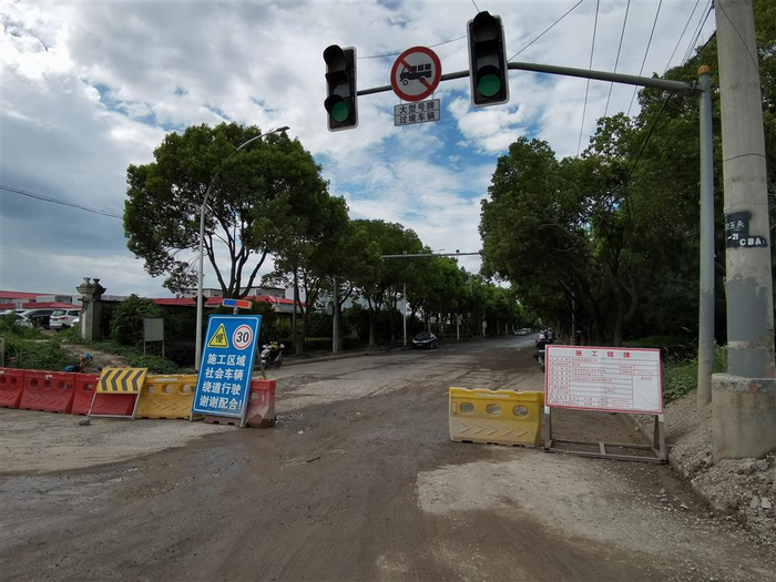 玉阳路如今如何?出了地铁松江南站站后,记者顺着水泥便道一路走到了便道与富永路的交叉口。路口西北侧,电线杆上挂着一块“施工结束”的指示牌。指示牌再往西,就是玉阳路了。玉阳路上土方车来往不断,站在路口向西眺望,一百余米外不远处有一座窄桥。几辆土方车正翻过桥面,往便道方向驶来。土方车尾部滚滚黄尘飞起,如同“沙尘暴”一般。一名路人骑着电动自行车迎面而去,看到眼前的“沙尘暴”连忙向路边躲避。可漫天扬尘哪里躲得过去,骑车人只能硬着头皮“钻”入沙尘中。尽管沙尘难忍,但窄桥东面的这一段玉阳路路况尚可,黄土砂砾下方,路面还是完好无损的。