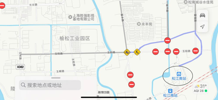 在没有被压坏前,这段1.5公里长的玉阳路是松江市民,尤其是地铁站西南侧的市民前往地铁站的主要通行道路,他们每天或骑电动自行车、或开车前往松江南站,再换乘9号线前往市区。玉阳路上还通行多条公交线路,终点站也是松江南站站。此外,玉阳路两侧布满了企业,其中还包括一个“榆松工业园区”。因此,玉阳路也是企业员工的通勤道路,重要性显而易见。