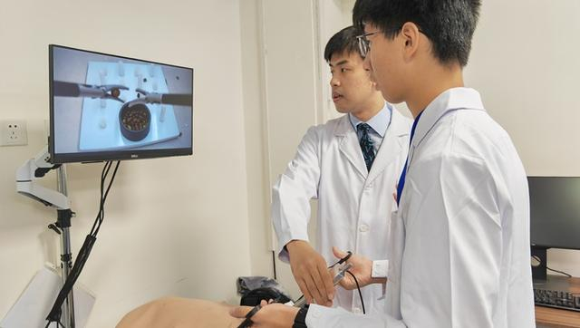 完成临床的体验后,营员们来到瑞金医院模拟医学实训中心,经过一番讲解之后,只见营员们一个个摩拳擦掌,纷纷站到模拟实训设备前,准备跟着老师体验腹腔镜手术操作、儿科胃肠镜操作。要保证手术的安全,医生对各种器械的熟练操作必不可少,而“夹绿豆”就是一项基本功。“这和我们徒手拿绿豆可不一样。”讲解医生介绍说,腹腔镜手术就好像在狭小的“钥匙孔”里操作,需要手眼协调配合。只见一名营员对着大屏幕,左手用器械慢慢地夹起一颗绿豆,再慢慢旋转,交叉传递给右手器械,可就在把绿豆放入孔的一瞬间,绿豆却蹦开了。“原来,哪怕是松开手术器械,也需要一点点进行,而不能一下松开。”
