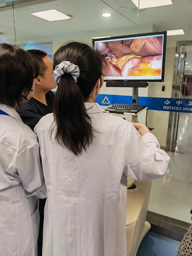 而在另一间直肠癌手术室中,营员们带上了3D眼镜,沉浸式体验外科医生们在病人的腹腔里面游刃有余的切除肿瘤。原来,为了能让手术主刀医生更清晰地看到患者腹腔中的情况,在错综复杂的血管中精准识别、精准定位,现在的腹腔镜手术探头采用3D技术,呈现出立体画面。“有时候,带上3D眼镜后,画面由二维变成三维,变得更立体,更清晰。”讲解医生在一旁解释。