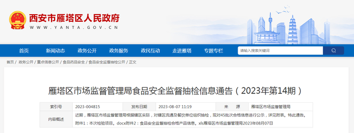 西安市雁塔区市场监管局发布2023年第14期食品安全监督抽检信息