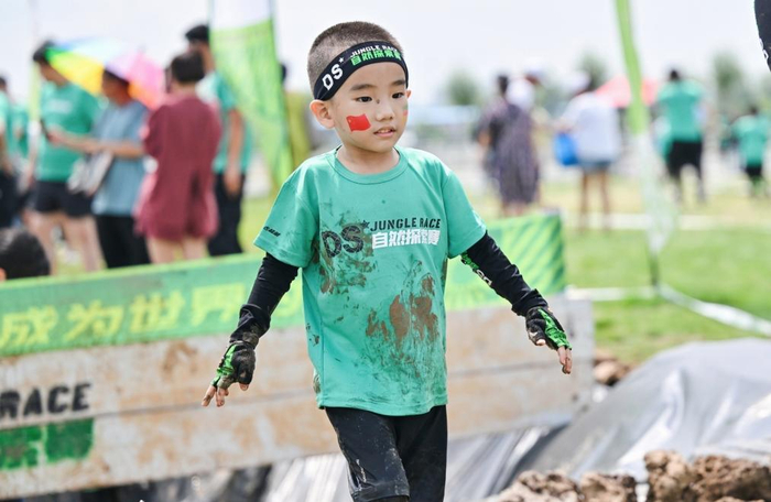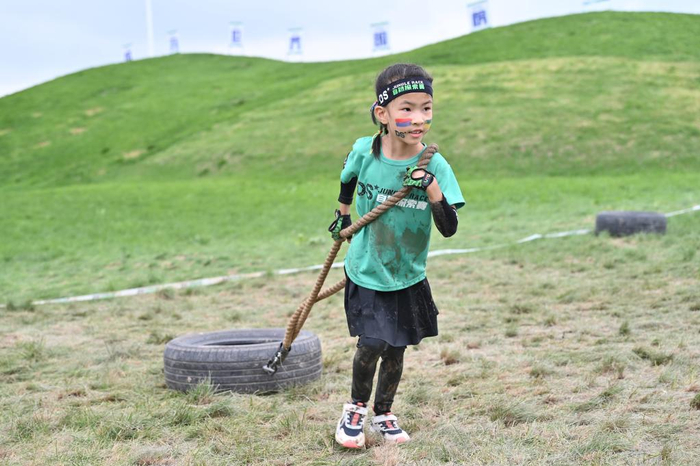 7月的最后一个周末,李九思跟着父母去参加了一项“DS自然探索赛”。这是一项越野闯关比赛,按照儿童年龄划分亲子、初级、中级、高级组别。孩子们根据各组赛道距离与障碍数量不同,分时段出发,闯过一道道“关卡”。翻栏板、攀网峰、爬矮网、过泥潭、拖轮胎……赛场上,加油声和欢笑声此起彼伏。