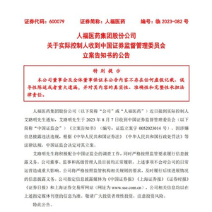8月7日收盘后,人福医药(600079.SH)披露公告称,公司实际控制人艾路明于2023年8月7日收到中国证监会《立案告知书》,因涉嫌信息披露违法违规,根据相关法律法规,证监会决定对其立案;但公告没有披露立案的具体事由。