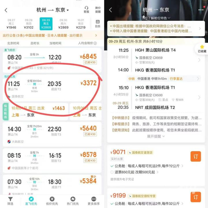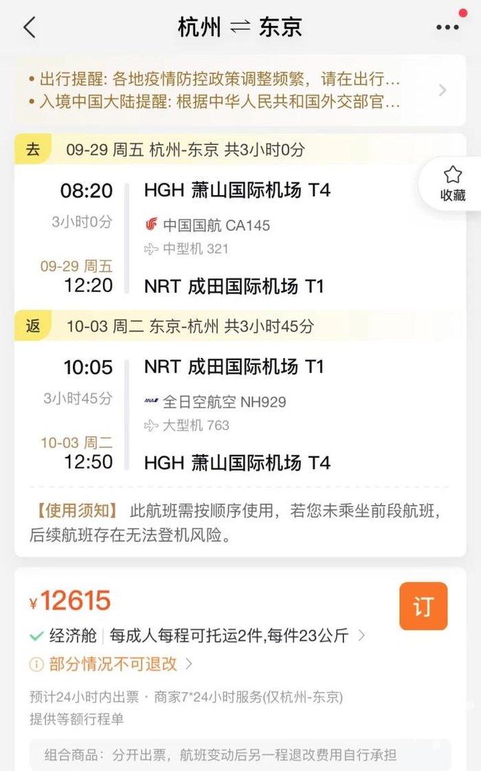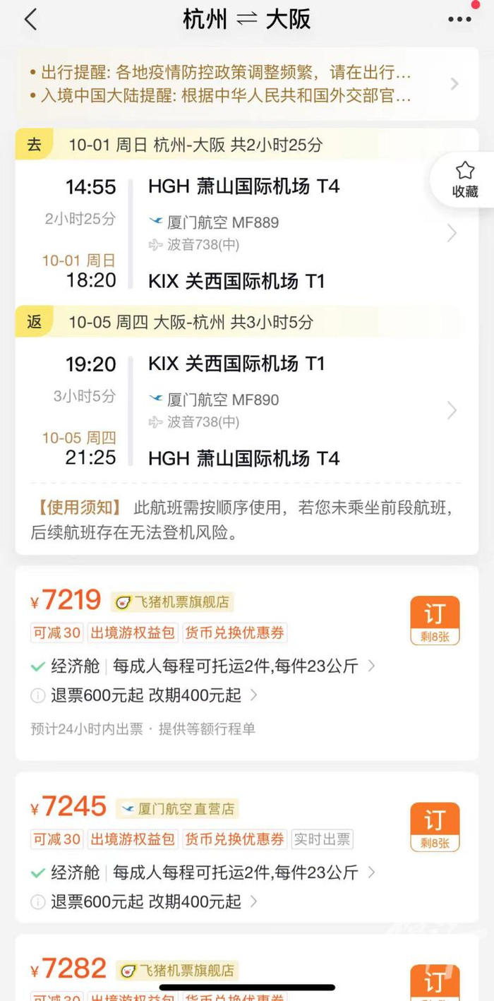 在飞猪App上,杭州到东京的机票价格,以9月29日出发、10月3日回程为例,若不考虑转机,目前乘坐国航去,全日空往返需要12000多元;杭州往返大阪的机票,10月1日出发、10月5日回程,乘坐厦门航空直飞的机票也要7200多元。