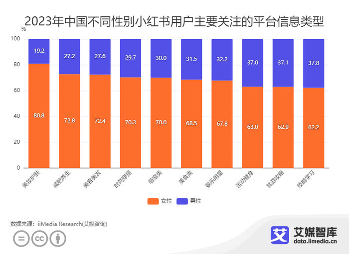 iiMedia Research(艾媒咨询)数据显示,在2023年中国不同性别小红书用户主要关注的平台信息类型中,美妆护肤、减肥养生、美容美发为女性用户主要关注的信息类型;技能学习、旅游攻略、运动健身为男性用户主要关注的信息类型。小红书平台的用户以女性群体居多,但其社区用户正渐渐发生转变。男用户比例已从个位数上涨到30%,社区内也在不断生产出新的内容趋势,内容和用户的增长仍在继续。