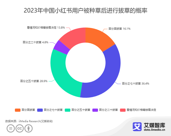 小红书平台特有的分享类、攻略类社区氛围,使得相关产品的种草属性天然生成,用户也自然而然地进行拔草与购买,社区内容和电商之间的通道在被逐渐打通。iiMedia Research(艾媒咨询)数据显示,在2023年中国小红书用户被种草后进行拔草的概率中,小红书用户被种草后进行拔草的概率总体而言较高。