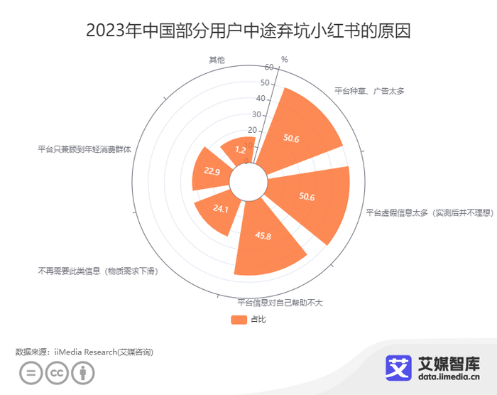 随着小红书商业化的步伐越迈越大,在受到部分用户喜欢的同时,也存在不少争议。依靠社区链路打通电商业务固然有其优势,但也难免引起部分用户反感;平台对于笔记内容的“完美主义”过度包装,“滤镜景点”充斥全网,虚假的美好大行其道。iiMedia Research(艾媒咨询)数据显示,在2023年中国部分用户中途弃坑小红书的原因中,50.6%的用户表示平台种草、广告太多,50.6%的用户表示平台虚假信息太多(实测后并不理想),45.8%的用户表示平台信息对自己帮助不大。
