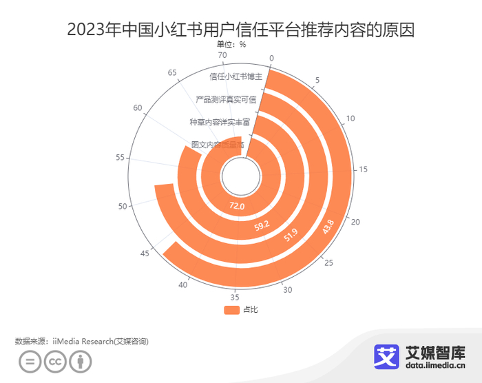 iiMedia Research(艾媒咨询)数据显示,在2023年中国小红书用户信任平台推荐内容的原因中,72%的用户表示小红书图文内容质量高,59.2%的用户表示小红书种草内容详实丰富,51.9%的用户表示小红书的产品测评真实可信。从用户信任推荐内容的原因分析中,我们大致能够窥见小红书平台内良好的运营生态。当多数人在小红书消费他人的生活经验,参考购物、游戏、美食等攻略分享时,新加入的内容生产者也会遵照这个社区的标准发布更多优质内容,从而形成良性循环。