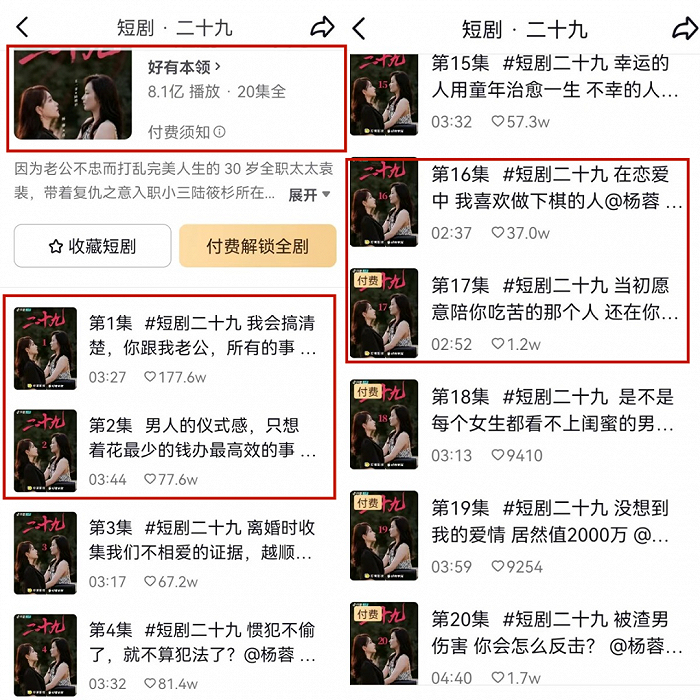 但至少到现在,短剧用户的付费习惯还没有养成。在抖音平台上,《二十九》前4集的点赞数都在50万以上,到第16集仍然有37万,但到了付费的第17集时,这一数字断崖式地下跌到了1.2万。