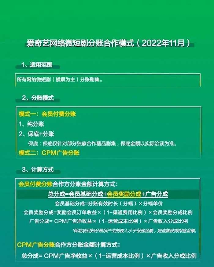 去年11月,爱奇艺在自家微信公众号发布了网络微短剧分账合作模式。面向上游微短剧创作方,创作方可通过会员付费分账或CPM广告分账模式上线爱奇艺平台。此举的目的显然是丰富内容供给,但从今年上半年仅仅7部的新剧数量来看,截止目前,此举还不足以补足爱奇艺的内容数量短板。