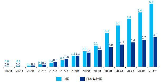 图表5:中日韩三国动力氨消费量及预测(单位:千万吨)