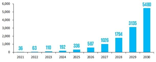目前绿氨生产仍处于探索和起步阶段,产业规模化仍有待时日。随着公众减碳意识的进一步提升以及政府关于碳排放和防止大气污染立法的进一步完善,相信绿氨的产业化发展将加快。从全球范围来看,2021年绿氨市场规模约为3,600万美元,到2030年预计将达到54.8亿美元,年均复合增长率达74.8%,潜力可观。