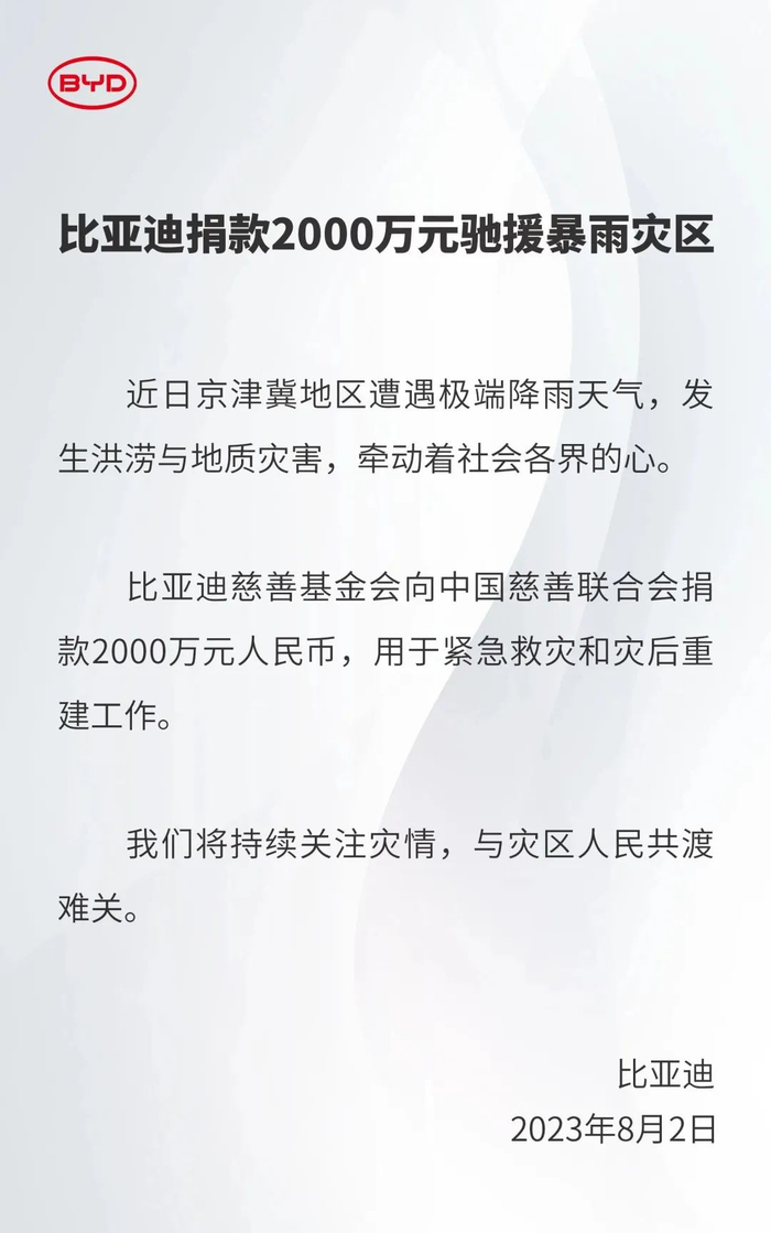 近日京津冀等地遭遇极端降雨天气,发生洪涝与地质灾害,牵动着社会各界的心。比亚迪慈善基金会向中国慈善联合会捐款2000万元人民币(资金已于8月2日20:58拨付到账),用于紧急救灾和灾后重建工作。