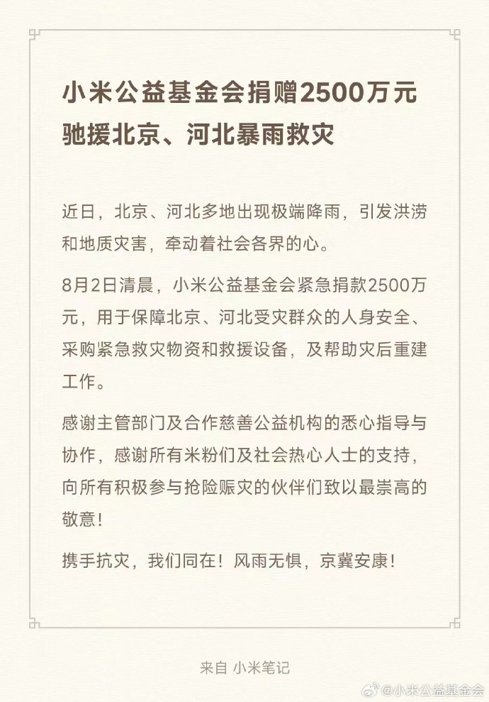 ·小米公益基金会捐赠2500万驰援北京、河北暴雨救灾