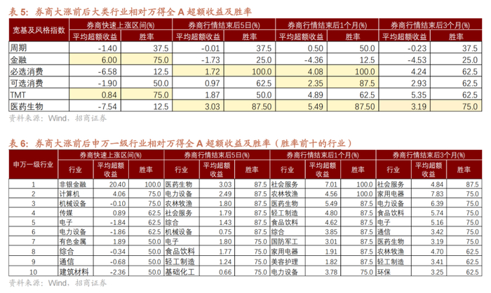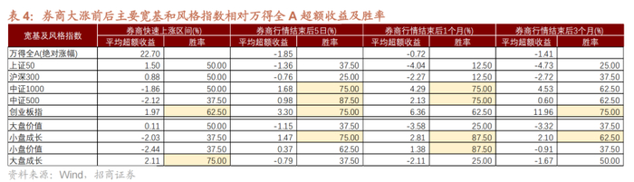 从市场风格来看,券商板块大涨期间、以及券商板块快速上涨结束后的1-3个月内,市场均以成长风格占优为主,不同的是,券商大涨期间多表现为大盘成长占优;而券商快速上涨结束后,则转为中小成长占优。具体来看,在8次券商大涨期间,A股大盘成长占优的概率为75%,相对万得全A的平均超额收益为2.11%;券商快涨结束后的5个交易日,小盘成长占优概率75%,相对万得全A的平均超额收益1.47%;结束后的1个月,小盘成长占优概率87.5%,平均超额收益2.81%。
