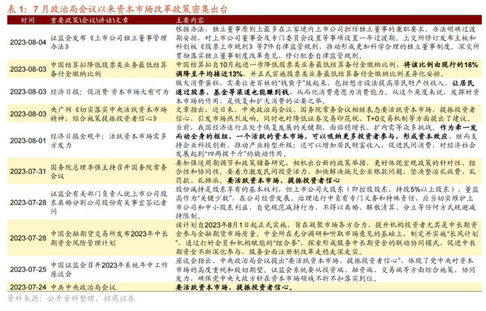 自7月24日政治局会议首提“要活跃资本市场,提振投资者信心”以来,券商指数大涨,7月25日至今已累计上涨18.7%;如果从底部的6月末计算,至今累计涨幅已经超过24%。究其原因,一是宏观环境边际向好,市场风险偏好修复。当前工业企业制造业部门的利润增速出现了明显拐点,1-6月份规模以上工业企业利润同比降幅继续收窄,7月制造业PMI连续2个月环比改善,中央政治局会议明确表示“加大宏观政策调控力度,着力扩大内需、提振信心”,经济基本面边际向好提振市场对于经济稳定的预期。二是资本市场再度迎来政策支持的发力周期。继政治局会议强调 “要活跃资本市场,提振投资者信心”,近期资本市场支持政策及表态密集发布。多家官媒发声助力“活跃资本市场”,中国结算发布公告拟自10月起将股票类业务最低结算备付金缴纳比例由16%进一步调降至平均接近13%,从而活跃资本市场,提振投资者信心。在各方面的利好刺激因素下,市场对A股后市预期明显回暖,近期A股周均成交额明显回暖,上周日均成交额回升至9569亿元,连续三周放量并于7月31日、8月4日两度突破万亿。