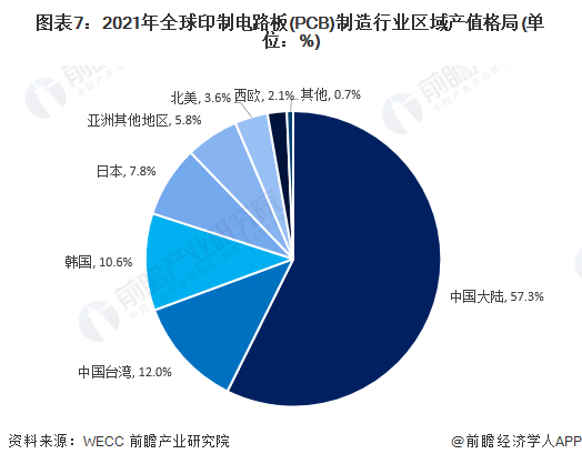 从全球印制电路板(PCB)制造行业区域产值格局来看,中国大陆、中国台湾、韩国及日本是全球PCB制造行业主要的制造基地。根据WECC数据,2021年中国产值规模达到全球产值的57.3%,中国台湾占比为12.0%,韩国及日本产值规模占比分别为10.6%及7.8%。参考Prismark数据,在2022年度中国大陆地区依旧是全球PCB产值规模最大的区域。