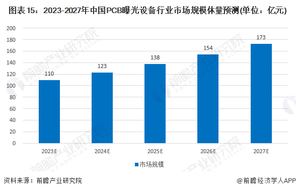 结合Uresearch发布的PCB曝光设备市场规模数据及前瞻对于PCB制造行业前景态势的展望,预计2023-2027年中国PCB曝光设备行业市场规模复合增速约12%,2027年中国PCB曝光设备行业市场规模将达到173亿元。