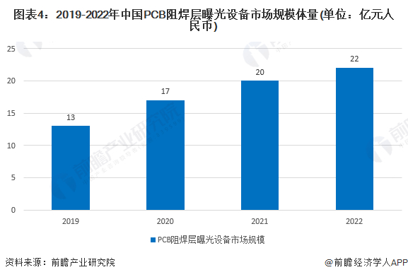 2019-2022年中国PCB阻焊层曝光设备行业市场规模同样呈持续上涨的态势,从2019年的13亿元增长至2022年的22亿元,2019-2022年市场规模复合增速约19%。