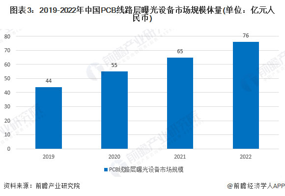在前述PCB曝光设备市场规模的基础上,结合PCB曝光设备市场需求调研情况分析,2019-2022年中国PCB线路层曝光设备行业市场规模呈持续上涨态势,市场复合增速约20%。2022年市场规模增长至76亿元左右,市场规模同比增长约16.9%。