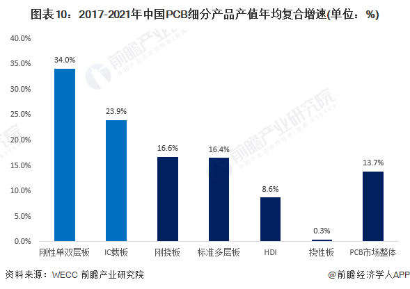 2017-2021年,中国PCB市场整体产值的年均复合增速为13.7%,而其中刚性单双层板及IC载板产值的年均复合增速遥遥领先其他细分产品。2017-2021年,刚性单双层板产值的年均复合增速达到34.0%,IC载板产值的年均复合增速达到23.9%。