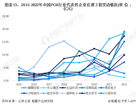 PCB曝光设备的市场需求主要来自下游PCB企业的设备投资支出,因此下游PCB企业的固定资产、在建工程等情况能够在较大程度上反映PCB曝光设备的市场需求潜力。一般而言,PCB企业扩产项目资本支出的增加首先体现为在建工程的增加,在项目完工后转入固定资产。扩产项目的建设周期一般为1.5-2年。