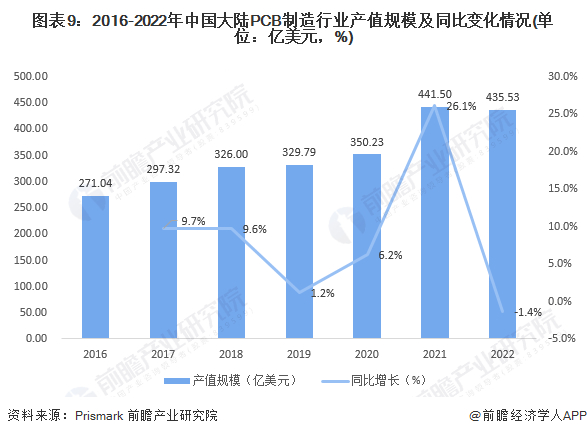 2016-2021年,中国大陆PCB产值规模整体呈现逐步上涨的态势,增速波动较为明显。2021年,由于需求复苏、技术要求升级以及原材料价格大幅度上涨等因素影响,推动中国PCB产值强劲增长。2021年,中国PCB产值规模达到441.50亿美元,同比增长26.10%。2022年,受全球宏观经济波动影响,中国PCB产值规模为435.53亿美元,同比下滑了1.4%。