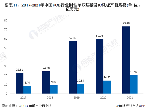 根据WECC发布的数据,2017-2021年,中国PCB制造行业刚性单双层板产值规模从22.81亿美元增长至73.48亿美元;IC载板从2017年的8.44亿美元增长至2021年的19.92亿美元。