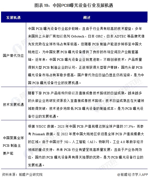 中国PCB曝光设备行业发展迅猛,由于国内已经汇聚了全球最主要的PCB制造产能,为产业链上游的PCB曝光设备提供了广阔的市场空间,未来行业发展机遇良好,具体而言主要有国产替代机遇、技术发展机遇、市场空间机遇。