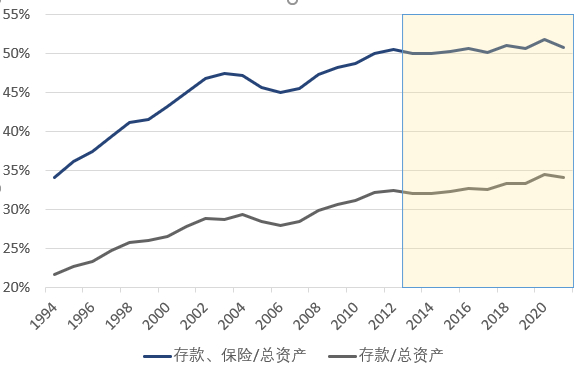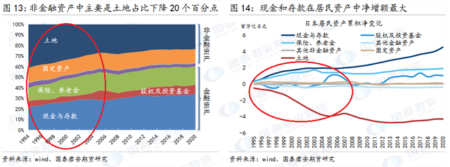 到2003年日本股市触底的时候,日本居民资产配置中,地产占比从最高近70%%收缩至50%以下,金融资产中,现金存款占总金融资产比例上升10个百分点达到55.3%,保险和养老金占26.8%,保守资产合计比例创历史新高。