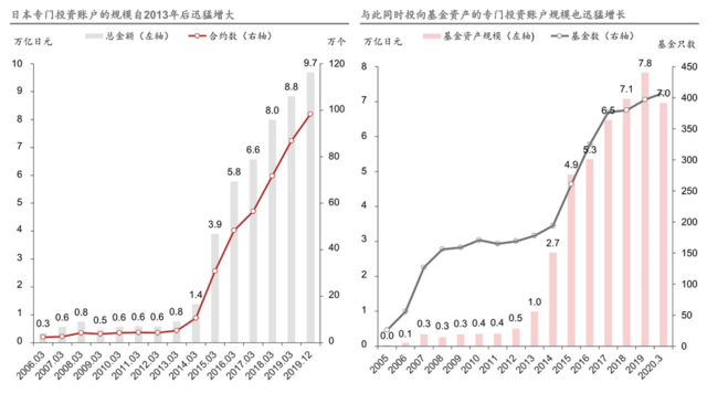 富裕人群也是日本财富管理机构眼中的香饽饽。富裕人群持有权益类资产占比37%,远高于全日本平均水平9%,但存款资产占比仅29%。例如野村证券专门为高净值客户提供的专户投资业务SMA和Fund Wrap自2013年后便出现快速扩张,6年间已经翻了6倍。