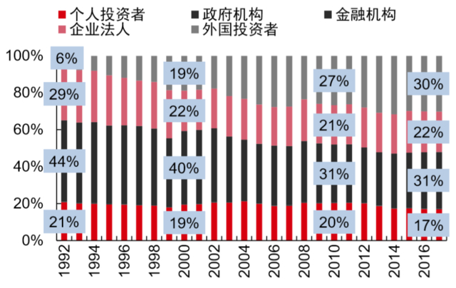 资产泡沫破裂后,随着日本股市的开放,企业、居民和金融机构在股市中的占比日渐压缩,而外资逐渐成为日股的主力。外资在日本股市的持股结构上占比约达到3成,交易结构上占比更是达到了7成,轻松把持了日本股市的定价权。