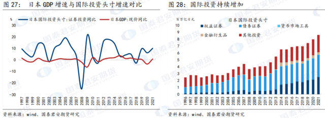 2000年以来,由于权益市场长期不景气和国内利率水平走低,海外资产配置成为日本财富增值的重要方式,日本对外投资增速均远高于GDP增速。