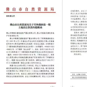 8月7日,网络流传一份佛山自然资源局红头文件,该文件名为《佛山市自然资源局关于尽快缴纳第一期土地出让价款的提醒函》,提醒对象为佛山市顺德区碧桂园房产置业有限公司(以下简称碧桂园顺德公司)和佛山市南海区碧创房地产开发有限公司。