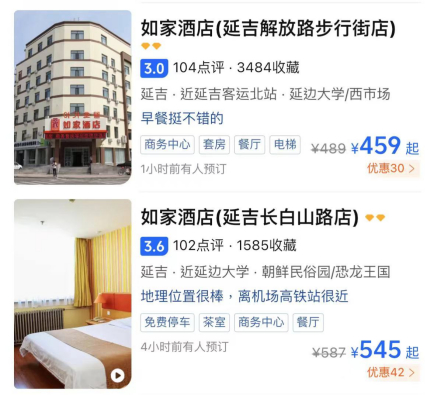 《财经》还发现,在吉林延边长白山,一家桔子酒店特惠双床房标价712元每晚,如家酒店(延吉长白山路店)双床房也需要587元每晚。
