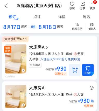《财经》搜索发现,汉庭酒店(北京天安门店)价格最低的大床房达到930元每晚,无窗15平方米,不含早餐;家庭房含有一张双人床和一张单人床,面积为20平方米,价格在1190元每晚。