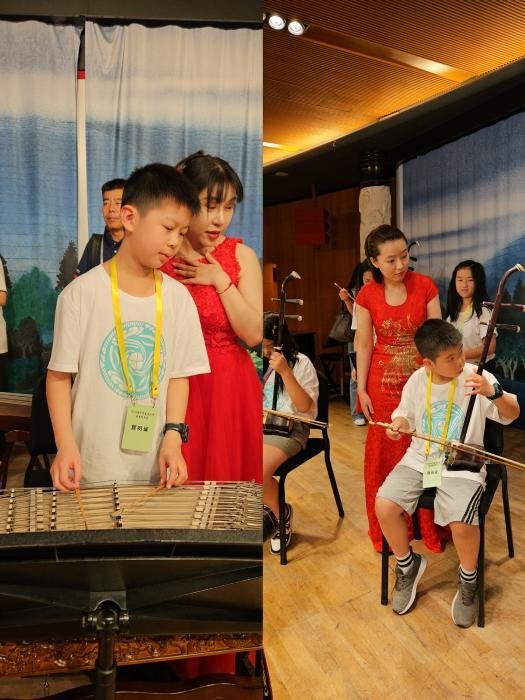 这次,他们可不放过这难得的民乐课,在老师演奏完后,就自告奋勇、亲自体验了现场的二胡、扬琴等民族乐器。弟弟赵夫宇在适应了下手中的二胡后,很快拉起了拿手曲目《赛马》,瞬间吸引了大家“围观”。