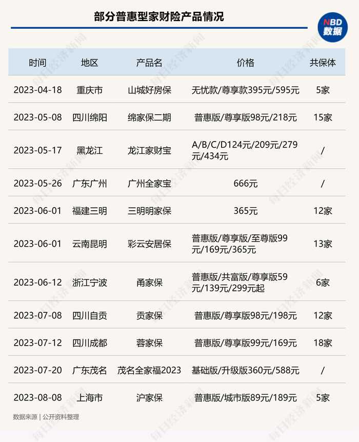 根据业内统计,近一年来,在全国已有20余款相关产品上线。《每日经济新闻》记者注意到,今年4月份以来,重庆、四川绵阳、福建三明、云南昆明、浙江宁波等超十个地区推出了普惠型家财险,价格区间为59元/年-666元/年,其中,普惠版价格普遍在不到百元水平。