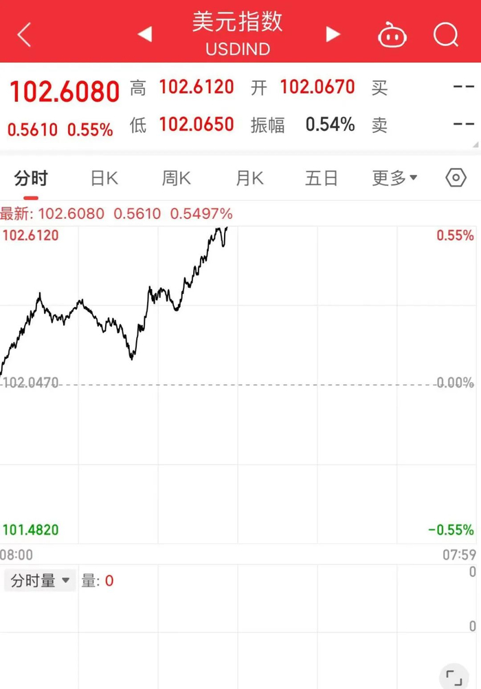 美元方面,8月8日亚盘,美元指数大幅高开。美元最新价报102.608,涨幅0.55%,延续前一日涨势。