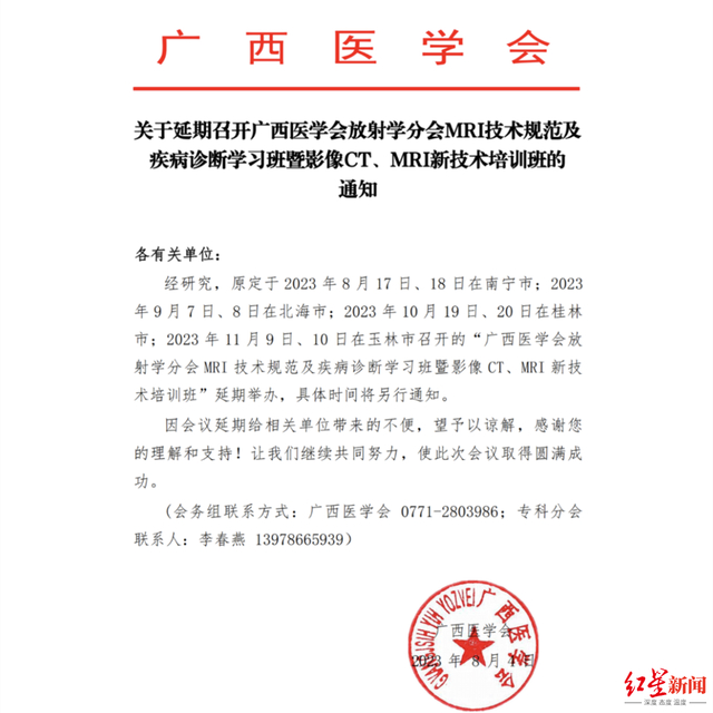浙江省医学会于8月2日发布了《关于延期召开2023年西湖呼吸治疗大会的通知》;中国非公立医疗机构协会于8月4日在官网发布《关于延期召开消化内镜专业委员会换届选举会议暨第五届学术年会的通知》;广西医学会也在公众号发布了《关于延期召开广西医学放射学会MRI技术规范及疾病诊断学习班暨影像CT、MRI新技术培训班的通知》;中国细胞生物学学会肿瘤细胞生物学分会于8月7日下午在其公众号发表《第四届全国肿瘤细胞生物学年会延期通知》……