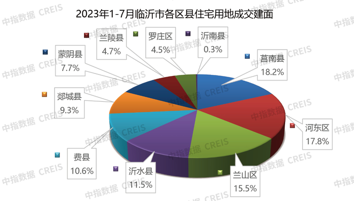 2023年1-7月,临沂市成交建面总计240.6万㎡,其中莒南县成交建面为43.8万㎡,在各区县成交中排在首位,全市占比18.2%。河东区排名第二,成交建面42.8万㎡,占比17.8%;兰山区成交建面37.2万㎡,排在第三位,占比15.5%。市辖区中罗庄区宅地供应量较少,目前排在第9位。