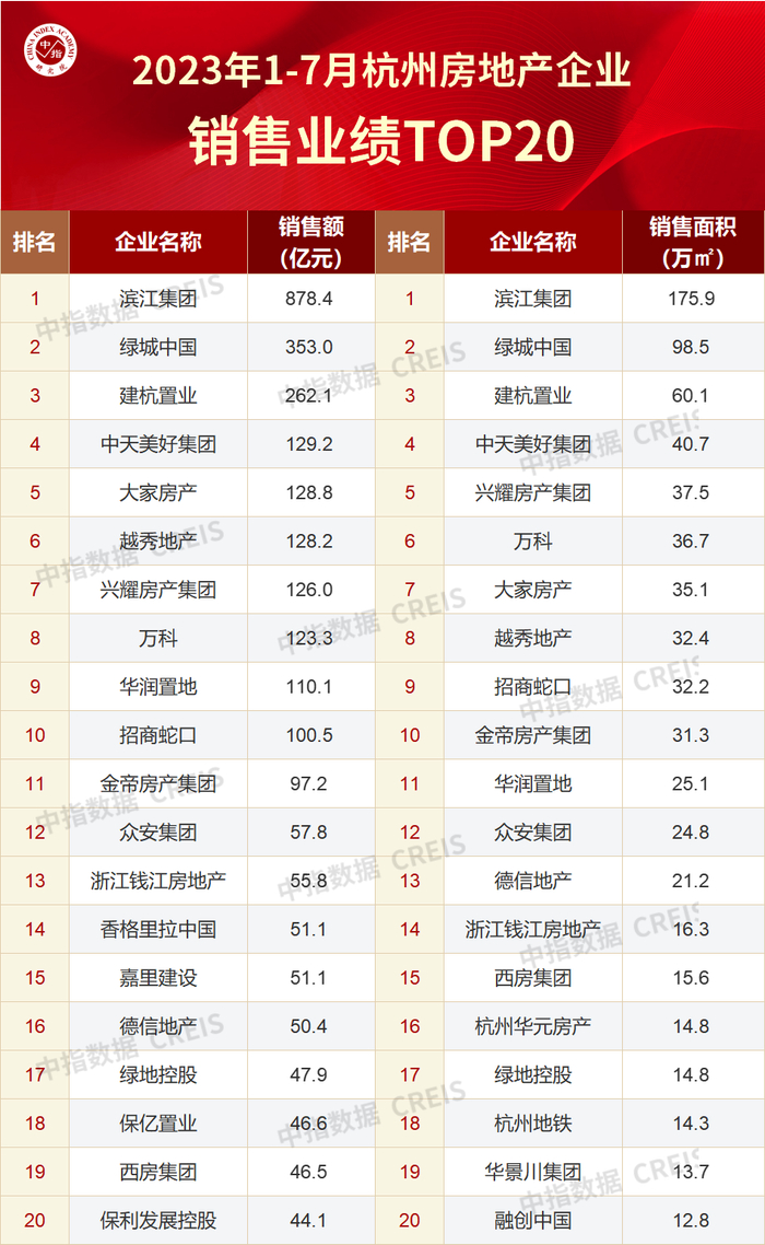 特别声明:杭州房地产企业销售数据统计是以2023年1月1日-7月31日期间销售的全口径商品房为统计口径,主要依据中指数据CREIS(点击查看)在杭州的销售监测数据,并参考当期总体经营情况和推盘去化情况进行分析统计;对于少数没有在监测范围内的项目,由企业提供相关证明文件,经课题组对数据进行严格审核,也纳入统计范围。本报告仅供参考,课题组不对使用报告及其内容所引发的任何直接或间接损失承担责任。